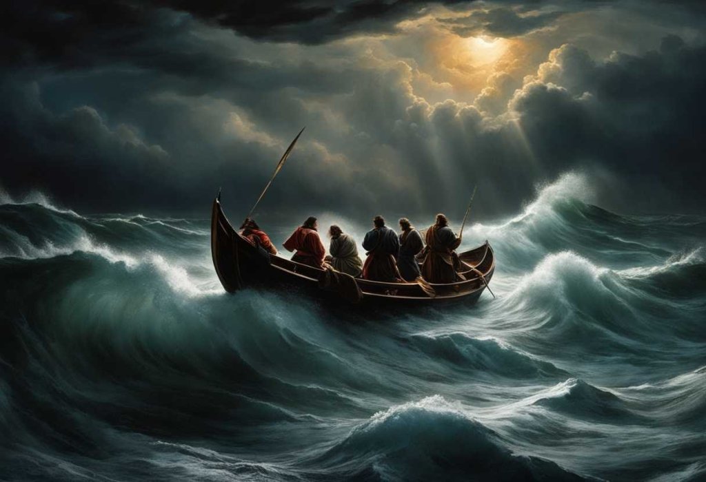 When evening came, his disciples went down to the lake, where they got into a boat and set off across the lake for Capernaum. By now it was dark, and Jesus had not yet joined them. A strong wind was blowing and the waters grew rough. When they had rowed about three or four miles, they saw Jesus approaching the boat, walking on the water; and they were frightened. But he said to them, “It is I; don’t be afraid.” Then they were willing to take him into the boat, and immediately the boat reached the shore where they were heading.